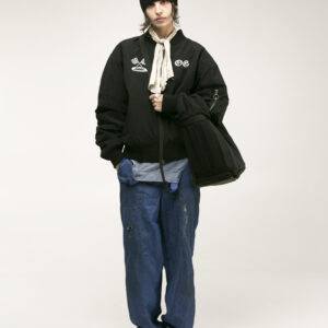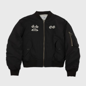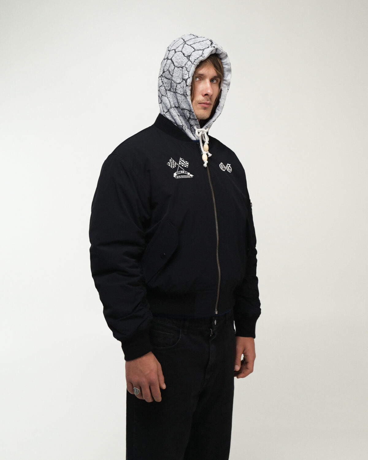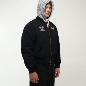 Black MA-1 Jacket with a “САМЕЦ” design. Embroidering at the chest in White color. Huge “САМЕЦ” appliqués embroidered at the back in Black and White colors.