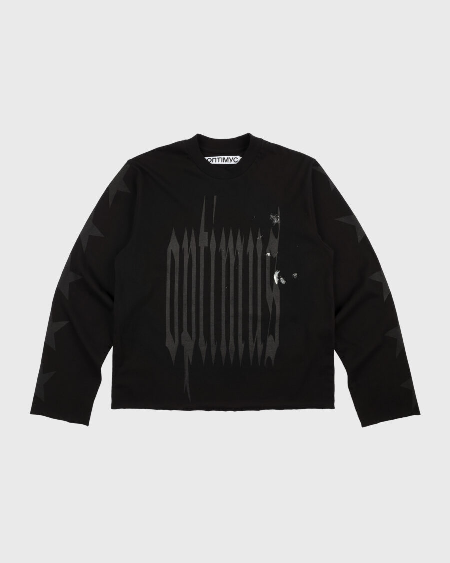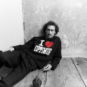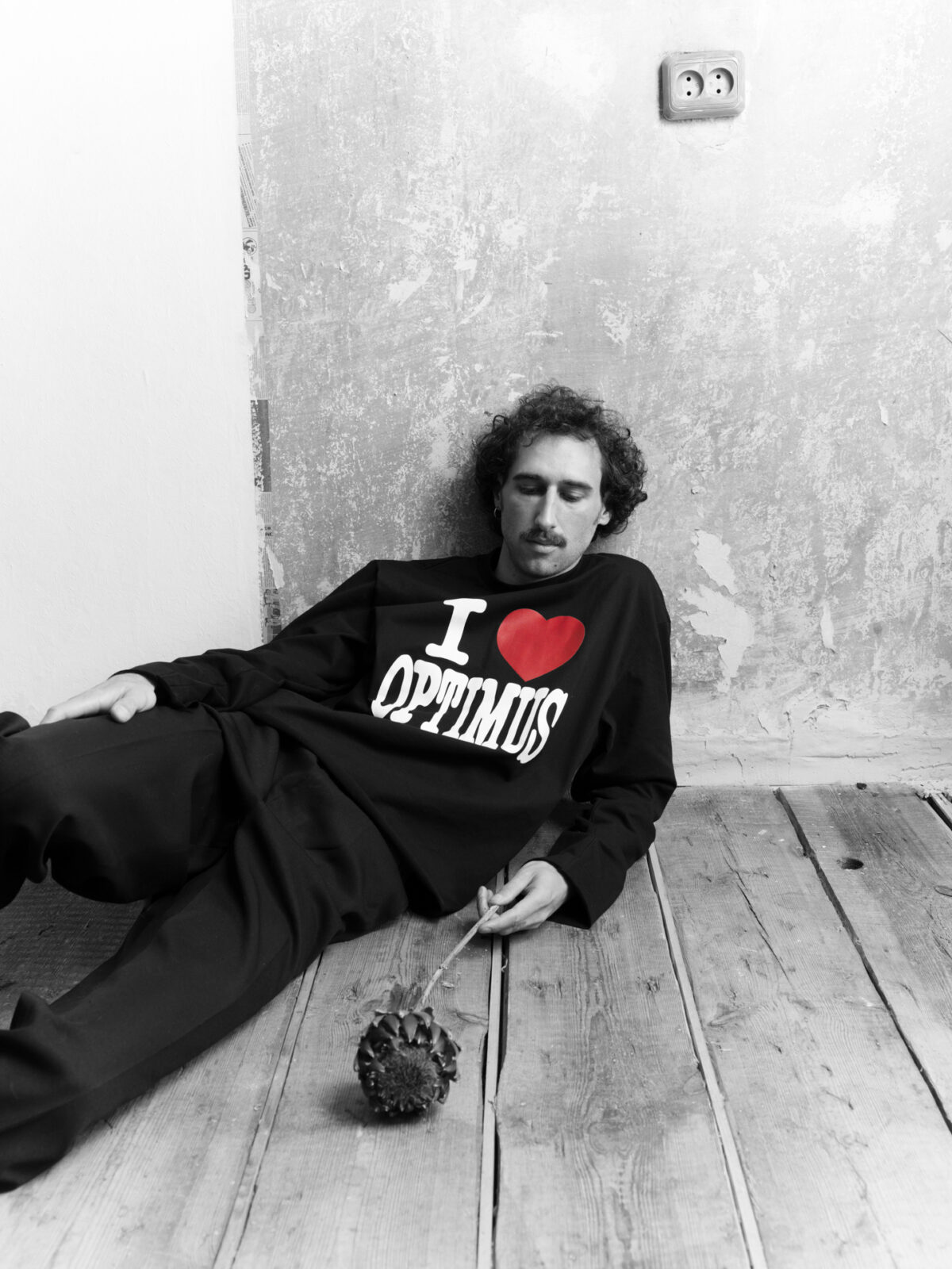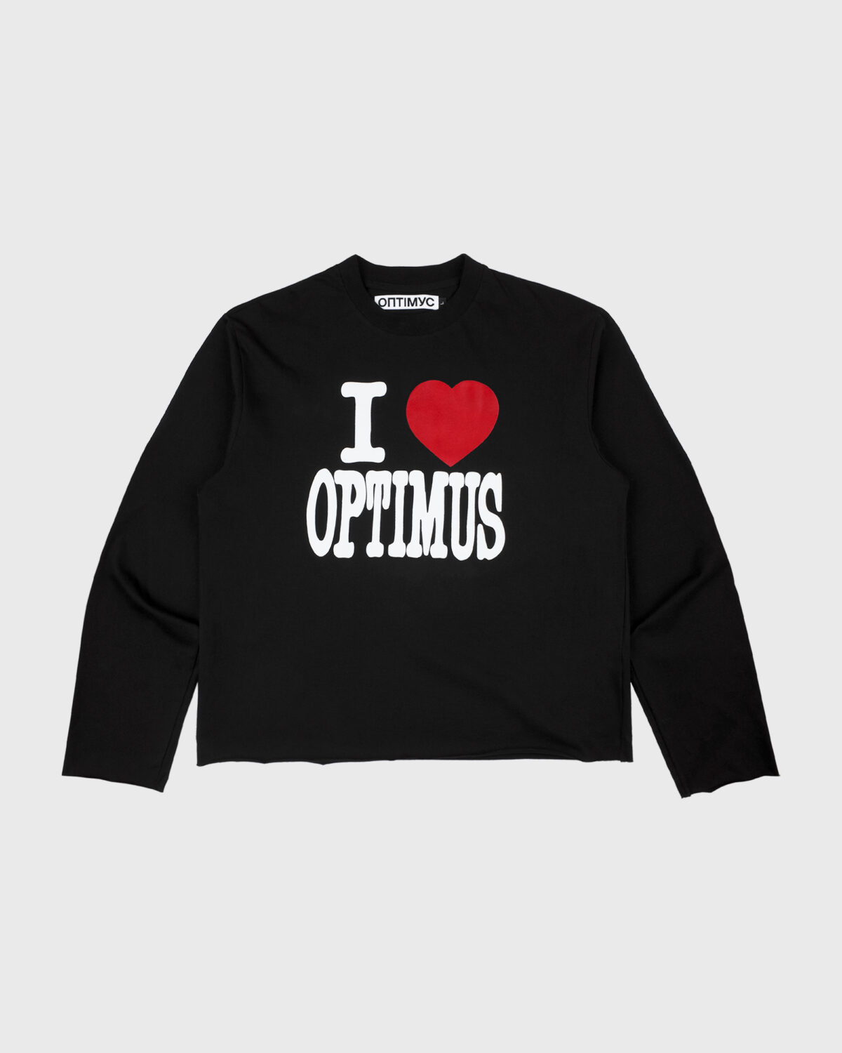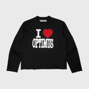 Black Long Sleeve T-Shirt with a “I <З OPTIMUS” design at front in White and Red color. – Comfort fit – Raw edges – Silkscreen printing – Made in Ukraine – 100% Сotton Artwork by Sasha Loh